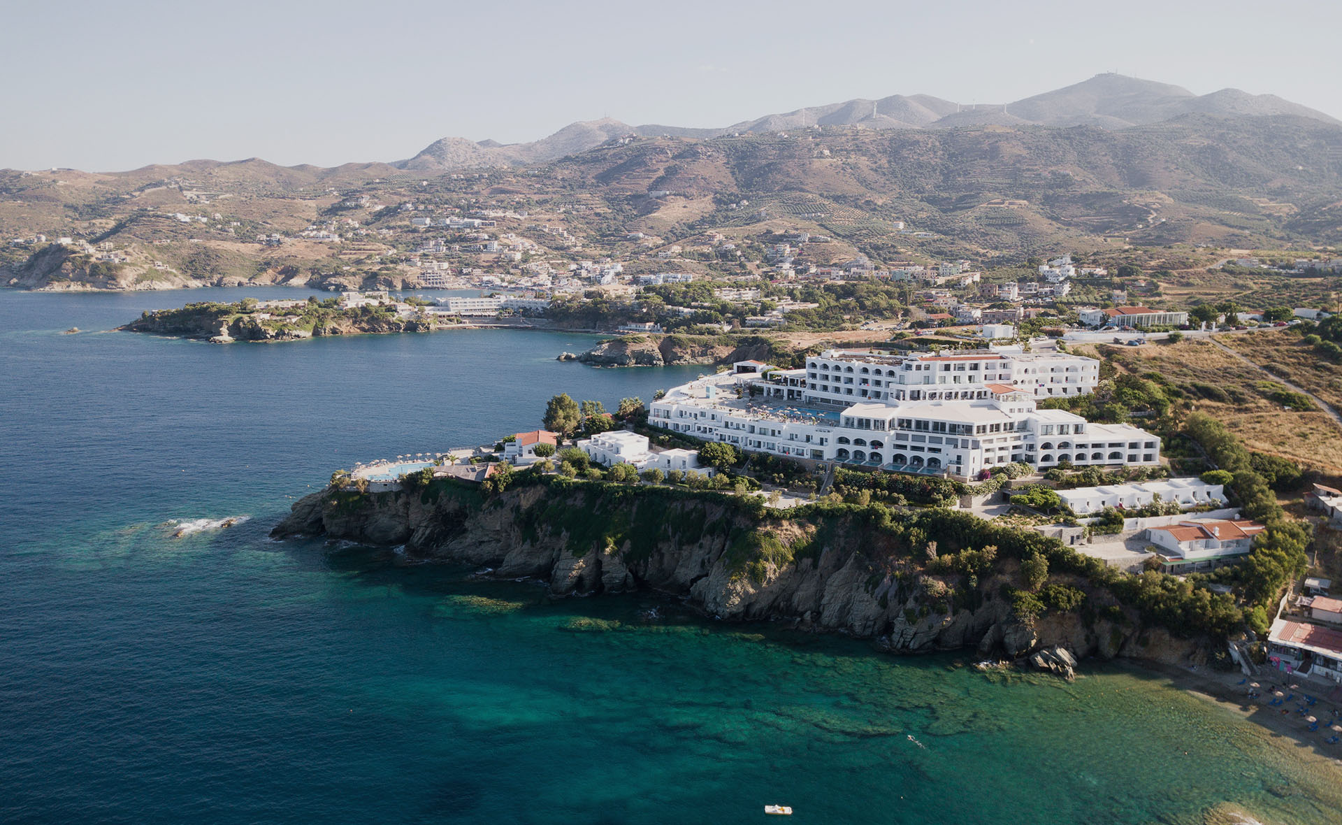 The Peninsula Resort and Spa is a seaside all-inclusive resort in Crete, located just outside the coastal village of Agia Pelagia, about 25 km from Heraklion, the island’s capital. Built amphitheatrically on a peninsula of distinct natural beauty, the resort lies between the bays of Mononaftis and Psaromoura, offering panoramic sea views and direct access to three beaches—a unique characteristic among hotels in the greater area.