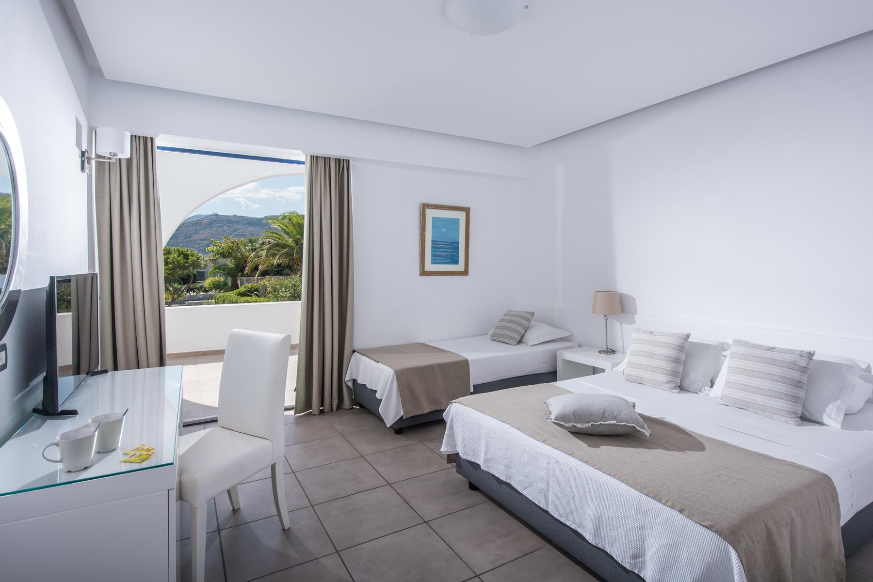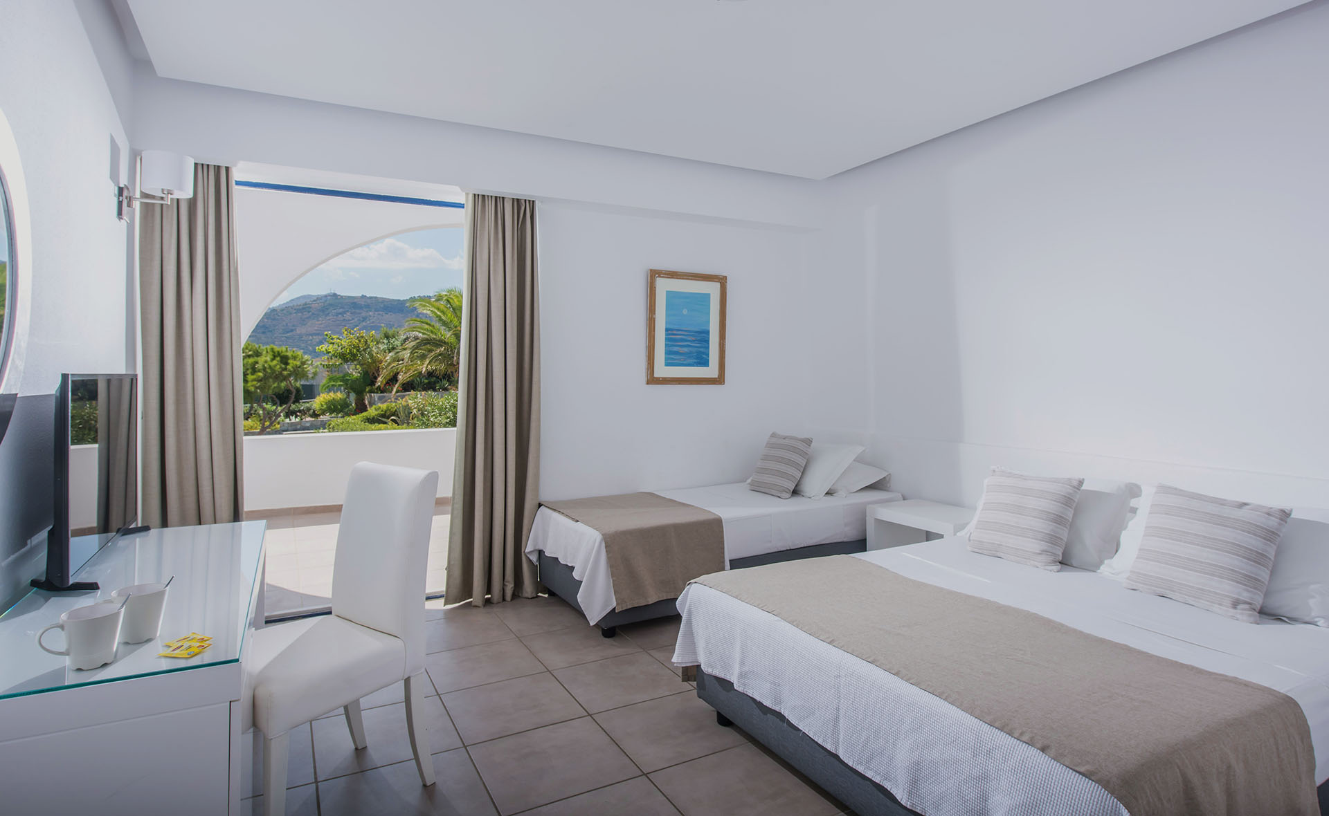 Our Double Rooms with Mountain / Garden View are minimal and fresh room types, which showcase Greek island design. They are either located in the resort’s main building or the annexe building near the entrance of the complex. Each room has an independent balcony or terrace with outdoor seating and views of our styled gardens, hotel grounds and the backdrop of the tranquil hilly areas.