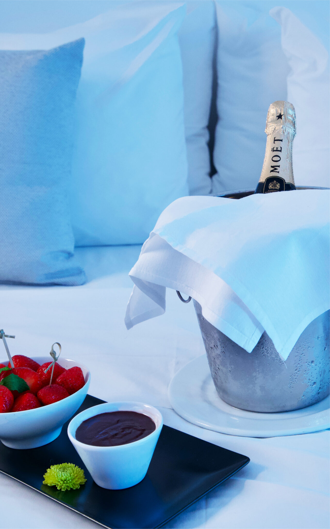 - Moët Champagne with freshly cut fruits and chocolate fondue (in-room)